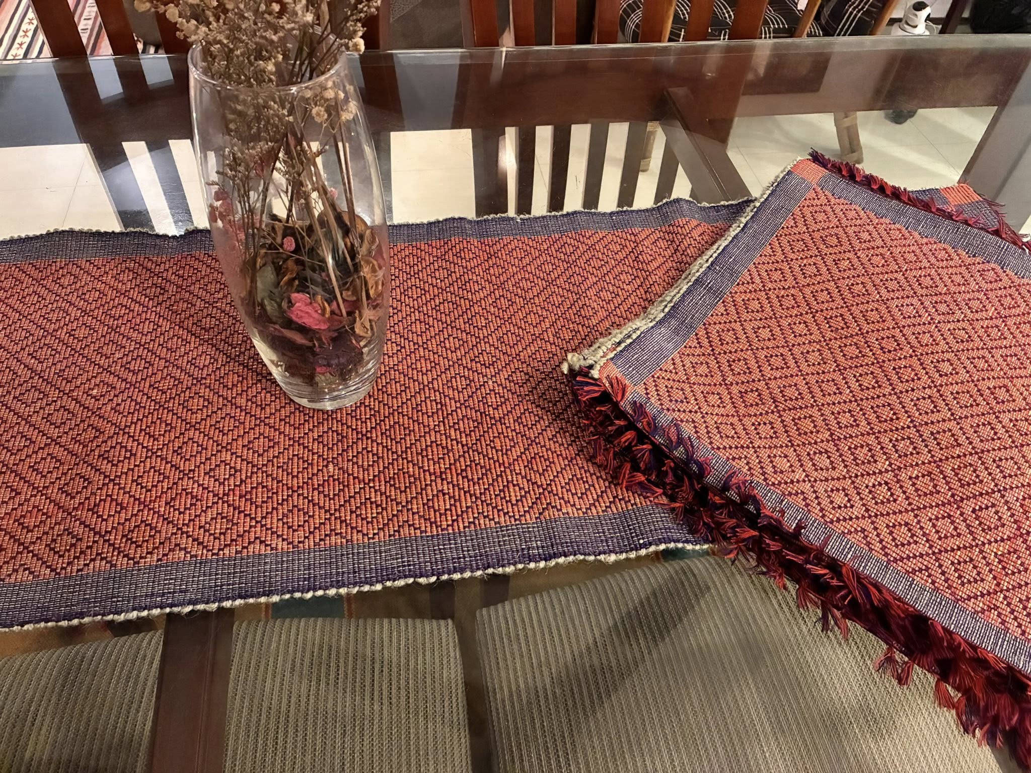 A beautifully woven table mat in warm earthy tones, featuring a subtle geometric pattern and hand-finished fringed edges. Perfect for adding a cozy, elegant touch to both everyday dining and special occasions.